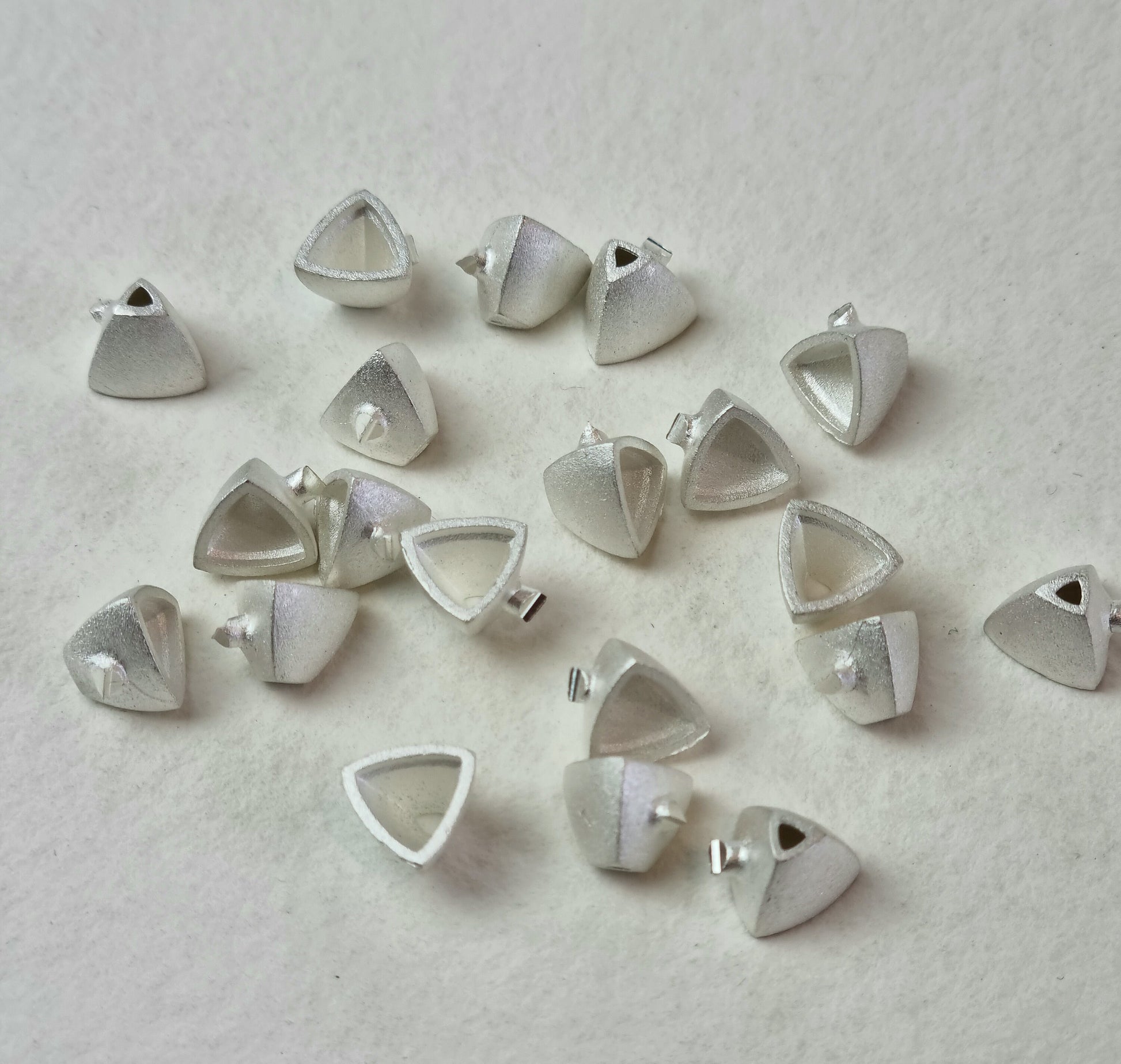 These settings are perfect for the increasingly popular 3 sided trillion stone. Great as studs, as a pendant with a bail, as a ring setting or in a more complicated piece with multiple settings. The sides of the setting taper and there is a ledge in the setting to help to seat the stone perfectly.